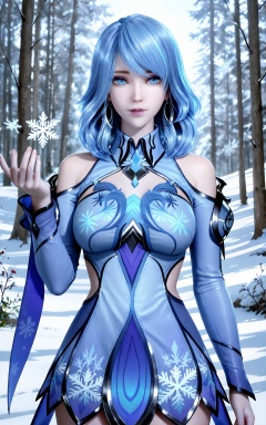 masterpiece,high quality,tall,game cg,highres,(soft light:1.2),white_skin,(shiny_skin:0.6),(realistic:1.1),<lora:水冰儿ILL:0.8>,shuibinger,blue hair,blue eyes,longeyelashes,makeup,medium hair,looking at viewer,long sleeves,nature,flowers,day,1girl,solo,dress,large breasts,earrings,jewelry,long hair,looking at viewer,hoop earrings,(collared_dress:1.1),bare shoulders,frills,short dress,print_dress,blue dress,winter,sonw,snow,ice,snowflakes,snowfakes floating on the hand,upper_body,