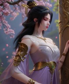 (oriental architecture, elegant decor, sophisticated style:1.1),(Resting against a tree, eyes closed, showing a moment of peaceful relaxation in nature,:1.1),(breasts:1.2),<lora:XL16克金玩家梅妃:0.95>,miss meifei,purple high slit corset dress,blue eyes,facial mark,black hair,draped looped buns with long cascading hair,hair ornament,jewelry,see-through capelet,bracelet,petals,, score_9,score_8_up,score_7_up,score_6_up,score_5_up,score_4_up,3d rendering,tag1,tag2, Cinematic Lighting,backlighting,, zPDXL3, zPDXL2,zPDXL, zPDXLxxx, zPDXLrl,