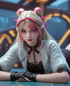 (oriental architecture, elegant decor, sophisticated style:1.1),(Lying on the stomach, propped up on elbows:1.1),(breasts:1.2),<lora:XL16克金玩家苏晓晓:0.95>,miss suxiaoxiao,white cropped jacket,black corset,pink eyes,forehead mark,double bun with long cascading hair,white hair,streaked hair,braid,black shorts,black fingerless gloves,thigh strap,single thighhigh,, score_9,score_8_up,score_7_up,score_6_up,score_5_up,score_4_up,3d rendering,tag1,tag2, Cinematic Lighting,backlighting,, zPDXL3, zPDXL2,zPDXL, zPDXLxxx, zPDXLrl,