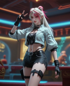 (oriental architecture, elegant decor, sophisticated style:1.1),(v, peace sign:1.1),(breasts:1.2),<lora:XL16克金玩家苏晓晓:0.95>,miss suxiaoxiao,white cropped jacket,black corset,pink eyes,forehead mark,double bun with long cascading hair,white hair,streaked hair,braid,black shorts,black fingerless gloves,thigh strap,single thighhigh,, score_9,score_8_up,score_7_up,score_6_up,score_5_up,score_4_up,3d rendering,tag1,tag2, Cinematic Lighting,backlighting,, zPDXL3, zPDXL2,zPDXL, zPDXLxxx, zPDXLrl,