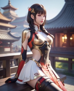 (oriental architecture, elegant decor, sophisticated style:1.1),(Resting on a bench in a busy city, looking tired but content after a long day of exploring,:1.1),(breasts:1.2),<lora:XL16穿越火线乔月:0.95>,miss qiaoyue,kevlar-orange boobplate,brown eyes,blunt bangs,black hair,front braided twin pigtails,hair ornament,pauldrons,arm guards,kevlar-orange abdomen armor panel,asymmetrical thighhighs with volt-orange and black,thigh holster,thigh strap,high heels,white overskirt,, score_9,score_8_up,score_7_up,score_6_up,score_5_up,score_4_up,3d rendering,tag1,tag2, Cinematic Lighting,backlighting,, zPDXL3, zPDXL2,zPDXL, zPDXLxxx, zPDXLrl,