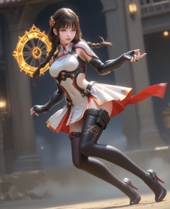 (oriental architecture, elegant decor, sophisticated style:1.1),(holding object:1.1),(breasts:1.2),<lora:XL16穿越火线乔月:0.95>,miss qiaoyue,kevlar-orange boobplate,brown eyes,blunt bangs,black hair,front braided twin pigtails,hair ornament,pauldrons,arm guards,kevlar-orange abdomen armor panel,asymmetrical thighhighs with volt-orange and black,thigh holster,thigh strap,high heels,white overskirt,, score_9,score_8_up,score_7_up,score_6_up,score_5_up,score_4_up,3d rendering,tag1,tag2, Cinematic Lighting,backlighting,, zPDXL3, zPDXL2,zPDXL, zPDXLxxx, zPDXLrl,