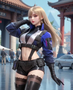 (oriental architecture, elegant decor, sophisticated style:1.1),(soaked:1.1),(breasts:1.2),<lora:XL16穿越火线岚兮儿保卫者:0.95>,miss lanxier,blue cropped jacket with tactical reflective patches,blue eyes,blonde hair,long hair,earrings,suspenders,black gloves,black shorts,midriff,black thighhighs,black thigh boots,, score_9,score_8_up,score_7_up,score_6_up,score_5_up,score_4_up,3d rendering,tag1,tag2, Cinematic Lighting,backlighting,, zPDXL3, zPDXL2,zPDXL, zPDXLxxx, zPDXLrl,