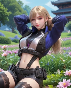 (oriental architecture, elegant decor, sophisticated style:1.1),(Lying on a field of flowers, hands intertwined behind the head, feeling relaxed,:1.1),(breasts:1.2),<lora:XL16穿越火线岚兮儿保卫者:0.95>,miss lanxier,blue cropped jacket with tactical reflective patches,blue eyes,blonde hair,long hair,earrings,suspenders,black gloves,black shorts,midriff,black thighhighs,black thigh boots,, score_9,score_8_up,score_7_up,score_6_up,score_5_up,score_4_up,3d rendering,tag1,tag2, Cinematic Lighting,backlighting,, zPDXL3, zPDXL2,zPDXL, zPDXLxxx, zPDXLrl,