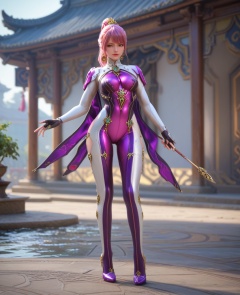 (oriental architecture, elegant decor, sophisticated style:1.1),(Standing with her dress billowing and hair flying back, she faces forward with determination, as if bracing against a strong gust:1.1),(breasts:1.2),<lora:XL16穿越火线步练师潜伏者:0.95>,miss bulianshiq,bodysuit,green eyes,eyeshadow,pink hair,ponytail,earrings,jewelry,hair ornament,fingerless gloves,skin tight,purple high heels,purple and white openwork catsuit,, score_9,score_8_up,score_7_up,score_6_up,score_5_up,score_4_up,3d rendering,tag1,tag2, Cinematic Lighting,backlighting,, zPDXL3, zPDXL2,zPDXL, zPDXLxxx, zPDXLrl,