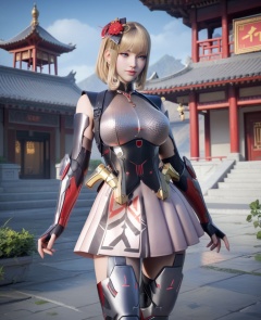 (oriental architecture, elegant decor, sophisticated style:1.1),(Standing with one foot in front, looking sideways,:1.1),(large breasts:1.2),<lora:XL穿越火线岚希儿灵魂舞者:0.95>,miss lanxier,chrome-fit battle top,neon pink skirt,blue eyes,blunt bangs,blonde hair,hair flower,black pauldrons,arm guards,armored high-heeled greaves,holstered,, score_9,score_8_up,score_7_up,score_6_up,score_5_up,score_4_up,3d rendering,tag1,tag2, Cinematic Lighting,backlighting,, zPDXL3, zPDXL2,zPDXL, zPDXLxxx, zPDXLrl,