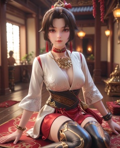 (oriental architecture, elegant decor, sophisticated style:1.1),(yoga:1.1),(large breasts:1.2),<lora:XL王者荣耀云缨:0.8>,miss yunying,red paired with white short kimono,black hair,short ponytail,bangs,red eyes,choker,hair ornament,sash,jewelry,tassel,lips,black thighhighs,greaves,, score_9,score_8_up,score_7_up,score_6_up,score_5_up,score_4_up,3d rendering,tag1,tag2, Cinematic Lighting,backlighting,, zPDXL3, zPDXL2,zPDXL, zPDXLxxx, zPDXLrl,