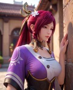 (oriental architecture, elegant decor, sophisticated style:1.1),(Leaning against a wall,:1.1),(large breasts:1.2),<lora:XL王者荣耀伽罗:0.8>,miss jialuo,purple right side robe layered on top of white sarashi,red hair,ponytail,twin braids,hair ornament,hair tubes,detached collar,armored dress,forehead mark,bangs,purple eyes,hair flower,white thighhighs,, score_9,score_8_up,score_7_up,score_6_up,score_5_up,score_4_up,3d rendering,tag1,tag2, Cinematic Lighting,backlighting,, zPDXL3, zPDXL2,zPDXL, zPDXLxxx, zPDXLrl,