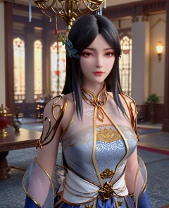 (oriental architecture, elegant decor, sophisticated style:1.1),(head down:1.1),looking at viewer,(breasts:1.2),<lora:XL斗破苍穹柳菲透纱新衣:0.95>,miss liufei,dress,long hair,black hair,chinese clothes,see-through,brown eyes,hair flower,parted bangs,makeup,, score_9,score_8_up,score_7_up,score_6_up,score_5_up,score_4_up,3d rendering,tag1,tag2, Cinematic Lighting,backlighting,