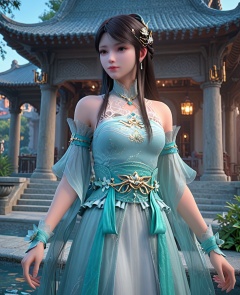 (oriental architecture, elegant decor, sophisticated style:1.1),(swimming:1.1),(breasts:1.2),<lora:XL斗破苍穹箫薰儿绿衣:0.95>,miss xuner,aqua dress,see-through fart curtain with white petticoat underneath,brown eyes,black hair,long hair,sash,hair ornament,detached see-through sleeves,earrings,jewelry,bare shoulders,wrist cuffs,, score_9,score_8_up,score_7_up,score_6_up,score_5_up,score_4_up,3d rendering,tag1,tag2, Cinematic Lighting,backlighting,
