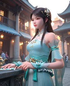 (oriental architecture, elegant decor, sophisticated style:1.1),(golfing:1.1),(breasts:1.2),<lora:XL斗破苍穹箫薰儿绿衣:0.95>,miss xuner,aqua dress,see-through fart curtain with white petticoat underneath,brown eyes,black hair,long hair,sash,hair ornament,detached see-through sleeves,earrings,jewelry,bare shoulders,wrist cuffs,, score_9,score_8_up,score_7_up,score_6_up,score_5_up,score_4_up,3d rendering,tag1,tag2, Cinematic Lighting,backlighting,
