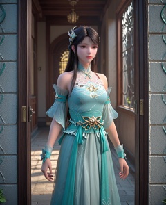 (oriental architecture, elegant decor, sophisticated style:1.1),(Standing in a doorway, half in shadow, half in light, creating a mysterious mood,:1.1),(breasts:1.2),<lora:XL斗破苍穹箫薰儿绿衣:0.95>,miss xuner,aqua dress,see-through fart curtain with white petticoat underneath,brown eyes,black hair,long hair,sash,hair ornament,detached see-through sleeves,earrings,jewelry,bare shoulders,wrist cuffs,, score_9,score_8_up,score_7_up,score_6_up,score_5_up,score_4_up,3d rendering,tag1,tag2, Cinematic Lighting,backlighting,