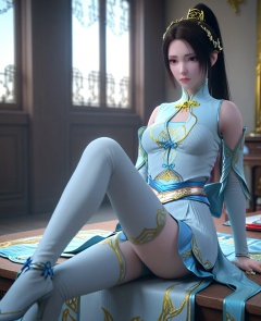 (oriental architecture, elegant decor, sophisticated style:1.1),(Sitting with legs crossed and hands in prayer position:1.1),(breasts:1.2),<lora:XL斗破苍穹纳兰嫣然:0.95>,miss nalanyanran,light blue dress,light blue overskirt,blue miniskirt,sash,black hair,ponytail,hair ornament,lips,elbow gloves,slender legs,brown eyes,lace pantyhose,light blue thigh boots,clothing cutout,back bow,, score_9,score_8_up,score_7_up,score_6_up,score_5_up,score_4_up,3d rendering,tag1,tag2, Cinematic Lighting,backlighting,