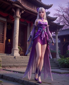 (oriental architecture, elegant decor, sophisticated style:1.1),(on tiptoes:1.1),(breasts:1.2),<lora:XL斗破苍穹小医仙P:0.85>,elder sister,purple dress,white hair,bangs,hair ornament,bare shoulders,brown eyes,purple veil,jewelry,fingerless gloves,blue footwear,sash,(facial tattoo:1.2),(cracked skin:1.2),purple eyes,, score_9,score_8_up,score_7_up,score_6_up,score_5_up,score_4_up,3d rendering,tag1,tag2, Cinematic Lighting,backlighting,