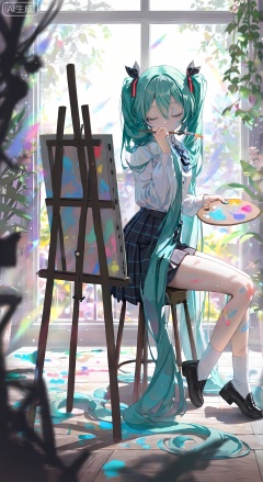1girl, solo, long hair, bangs, skirt, shirt, long sleeves, bow, ribbon, holding, hair between eyes, twintails, sitting, very long hair, school uniform, full body, closed eyes, hair ribbon, white shirt, hair bow, pleated skirt, green hair, shoes, socks, indoors, black skirt, black footwear, window, black bow, white socks, loafers, bandaid, paintbrush, bandaid on leg, paint, holding paintbrush, palette \(object\), canvas \(object\), hatsune miku