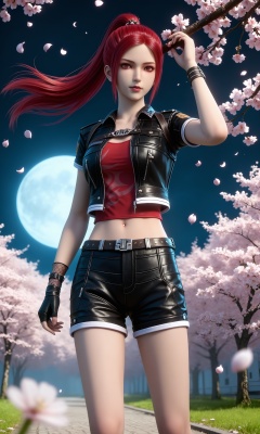 <lora:游侠战纪-秦梨落Pony:0.7>,1girl,striking red hair,high ponytail,red eyes,black leather jacket with white trim,red crop top,belt,black leather shorts,, masterpiece,best quality,solo,1girl,upper body,petals,looking at viewer,moon,branch,cherry blossoms,flower,extreme aesthetic,(quasarcake:0.7),masterpiece,best quality,good quality,newest,very aesthetic,absurdres,A shot with tension,(Visual impact,giving the poster a dynamic and visually striking appearance:1.2),impactful picture,offcial art,colorful,splash of color,movie perspective,