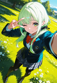 1girl,school_uniform,black_pantyhose,light_green_hair,long_hair,low_twintails,from_above,v,wink,flower,Grass,puddles,(mika pikazo),(yoneyama mai),(kkia),(le (huanglongen)),(z3zz4),masterpiece,best quality,amazing quality,depth of field,lazypos,lazyup,high detail,subtle,high contrast,colorful depth,chiaroscuro,impasto,(shallow depth of field:1.4),(foreshortening:1.4),dutch angle,dynamic pose,dynamic angle,