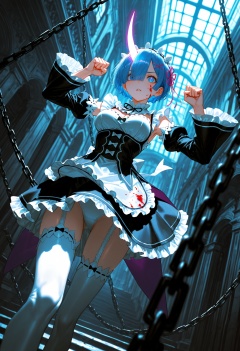absurdres,newest,scenery,1 girl,solo girl,dynamic pose,fighting pose,wide shot,close up,from below,dutch angle,rem \(re:zero\),glowing horn,single horn,rem,blue eyes,blue hair,hair ornament,hair over one eye,hair ribbon,short hair,x hair ornament,(looking at viewer:1.1),angry,crazy face,(parted lips:1.1),(glowing horn:1.8),blood on face,apron,black bow,black dress,black ribbon,bow,detached sleeves,dress,frilled apron,frilled sleeves,frills,juliet sleeves,long sleeves,maid,neck ribbon,puffy sleeves,ribbon,roswaal mansion maid uniform,thighhighs,two-tone dress,waist apron,white bow,white dress,white thighhighs,blood on clothes,morningstar on chain,white panties,masterpiece,best quality,amazing quality,very aesthetic,absurdres,newest,scenery,volumetric lighting,(artist:quasarcake:0.8),extreme aesthetic,(wlop:0.6),honjou honjou raita,lack,rella,wanke,raita,lack,rella,wanke,masterpiece,best quality,good quality,newest,year 2024,year 2023,very aesthetic,absurdres,Visual impact,A shot with tension,ultra-high resolution,32K UHD,sharp focus,best-quality,masterpiece,Emotionalization,unconventional supreme masterpiece,masterful details,temperate atmosphere,with a high-end texture,in the style of fashion photography,(Visual impact:1.2),giving the poster a dynamic and visually striking appearance,impactful picture,masterpiece,best quality,absurdres,newest,very aesthetic,amazing quality,highres,sensitive,masterpiece,best quality,amazing quality,depth of field,lazypos,lazyup,high detail,subtle,high contrast,colorful depth,chiaroscuro,impasto,(shallow depth of field:1.4),(foreshortening:1.4),ultra-detailed,sharp focus,ray tracing,best lighting,detailed illustration,detailed background,cinematic,beautiful face,beautiful eyes,ambient occlusion,raytracing,soft lighting,absolutely eye-catching,intricate cinematic background,dutch angle,dynamic angle,