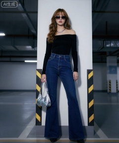 服装: 上身是一件修身的黑色一字肩针织衫,露出直角肩;下身搭配高腰的深蓝色微喇牛仔长裤,裤脚盖住鞋面。