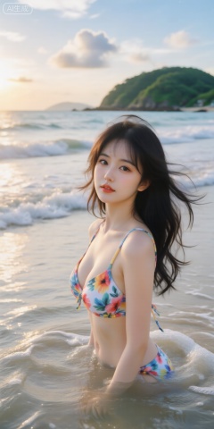 海滩上的一名女子穿着色彩鲜艳的花朵比基尼吊带背心,站在浅水中,她有一头乌黑的长发,随风飘扬,身材修长,曲线优美,天空晴朗,飘着几朵云,夕阳西下,投射出温暖的金色光芒,背景是一片宁静的海滩,海浪轻柔,远处还有一座郁郁葱葱的绿色岛屿,该图像是一张高分辨率照片,具有柔和,自然的调色板,整体美感宁静而温馨,