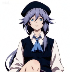 looking at viewer,anime_style,fu_hua,blue eyes,grey hair,hair ornament,hair between eyes,shirt,white shirt,collared shirt,skirt,vest,blue necktie,hat,beret