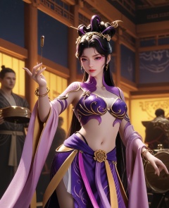 (oriental architecture, elegant decor, sophisticated style:1.1),(drumming:1.1),(breasts:1.2),<lora:XL16牧神记付磬允:0.95>,miss fuqingyun,purple belly dance bra,purple tiered high-low skirt with train,purple eyes,facial mark,black hair,streaked hair,looped bun with tresses,very long hair,hair ornament,jewelry,hagoromo,bracelet,, score_9,score_8_up,score_7_up,score_6_up,score_5_up,score_4_up,3d rendering,tag1,tag2, Cinematic Lighting,backlighting,