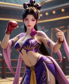 (oriental architecture, elegant decor, sophisticated style:1.1),(boxing:1.1),(breasts:1.2),<lora:XL16牧神记付磬允:0.95>,miss fuqingyun,purple belly dance bra,purple tiered high-low skirt with train,purple eyes,facial mark,black hair,streaked hair,looped bun with tresses,very long hair,hair ornament,jewelry,hagoromo,bracelet,, score_9,score_8_up,score_7_up,score_6_up,score_5_up,score_4_up,3d rendering,tag1,tag2, Cinematic Lighting,backlighting,