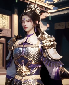 (oriental architecture, elegant decor, sophisticated style:1.1),(Parkour:1.1),(breasts:1.2),<lora:XL16牧神记虞渊初雨:0.95>,female general,white armor,orange eyes,forehead pendan,black hair,very long hair,half-up braid with long cascading hair,earrings,pauldrons,vambraces,sash,faulds,purple cape,jambeau,, score_9,score_8_up,score_7_up,score_6_up,score_5_up,score_4_up,3d rendering,tag1,tag2, Cinematic Lighting,backlighting,