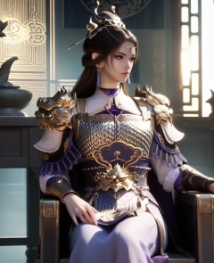 (oriental architecture, elegant decor, sophisticated style:1.1),(Sitting on a chair with legs crossed, resting chin on hand,:1.1),(breasts:1.2),<lora:XL16牧神记虞渊初雨:0.95>,female general,white armor,orange eyes,forehead pendan,black hair,very long hair,half-up braid with long cascading hair,earrings,pauldrons,vambraces,sash,faulds,purple cape,jambeau,, score_9,score_8_up,score_7_up,score_6_up,score_5_up,score_4_up,3d rendering,tag1,tag2, Cinematic Lighting,backlighting,