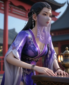 (oriental architecture, elegant decor, sophisticated style:1.1),(Leaning forward with elbows on a table:1.1),(breasts:1.2),<lora:XL16墓王之王沐雪离第一版:0.95>,miss muxueli,blue violet gown with floral print,blue eyes,see-through veil,black hair,half-up crown braid with long cascading hair,head chain,sash,bracelet,, score_9,score_8_up,score_7_up,score_6_up,score_5_up,score_4_up,3d rendering,tag1,tag2, Cinematic Lighting,backlighting,
