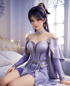 (oriental architecture, elegant decor, sophisticated style:1.1),(Sitting on the edge of a bed, looking thoughtful,:1.1),(breasts:1.2),<lora:XL遮天姬紫月2:0.95>,miss jiziyue,blue dress,shawl sleeves,purple hair,jewelry,bare shoulders,elbow gloves,sash,blue eyes,hair ornament,tassels,ponytail,inner skirt,, score_9,score_8_up,score_7_up,score_6_up,score_5_up,score_4_up,3d rendering,tag1,tag2, Cinematic Lighting,backlighting,