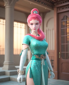 (oriental architecture, elegant decor, sophisticated style:1.1),(Standing with hands on the hips, looking determined:1.1),(breasts:1.2),<lora:XL妖神记龙羽音:0.95>,miss longyuyin,green chinese clothes,jewelry,pink hair,ponytail,white gloves,elbow gloves,sash,makeup,green eyes,tassel,bracelet,right side slit,eyelashes,, score_9,score_8_up,score_7_up,score_6_up,score_5_up,score_4_up,3d rendering,tag1,tag2, Cinematic Lighting,backlighting,