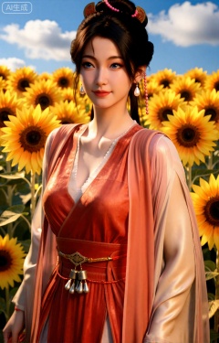 慕沛灵,身着一袭橘红色长裙,外披粉白薄纱,站在成片的向日葵花田中。她的发间戴着红粉相间的珠链,搭配水滴形珍珠耳坠,腰间红色绸带两端的银铃轻轻晃动。阳光洒在她身上,照亮了她略带羞怯与温柔的脸庞,背景是金黄色的向日葵花海,与她的红衣形成鲜明对比,天空湛蓝,飘着几朵蓬松的白云。
