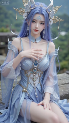 1girl, long hair, solo, dress, hair ornament, long hair, mischevious smile, perfect body, scenery, sharp focus, best quality, masterpiece, detailed outfit, illustration, perfect eyes, finely detailed beautiful anime eyes, realistic skin, intricate details, best lighting, depth of field, ultra high resolution, sitting