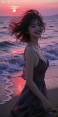 风中回眸半身,惊艳容貌,蓬松刘海在海风中飘动,动态模糊和发丝分离如落日余晖,嘴角上扬带生活热爱,侧身正面照,暗调转化为沙滩落日氛围,有沙滩夕阳余晖,海浪拍打,超现实主义与印象派融合,细节有沙滩质感,海浪波纹,落日色彩描绘,色彩以红粉紫为主,淡彩且温暖,低光氛围浪漫温馨宁静,个性视角非对称,对焦人物主体,周边虚焦暗朦过曝模拟沙滩光影交错,景深,高噪点,强烈胶片颗粒质感,层次丰富,暗角是无垠大海,写意,光的美学,概念艺术,超现实,高级感,富士胶片,杰作,曝光感,