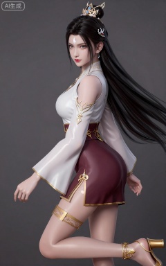 她有一头长长的、飘逸的黑色头发,像瀑布一样垂在背上。她的皮肤白皙,穿着一套非常时髦的现代衣服,包括一件白色的无袖上衣,上面镶着金色的镶边,袖子很宽。上衣搭配一件栗色的高腰短裙,(短裙)款式是包臀裙,上面装饰着金色的花边和金色的流苏,后面没有裙摆,她的右大腿上有一个吊袜带,右腿穿着非常透明的丝袜,上面装饰着复杂的金色图案。她的鞋子由金色及踝凉鞋和精致的绑带组成。