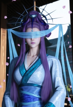 masterpiece,best quality,amazing quality,very aesthetic,high resolution,ultra-detailed,absurdres,scenery,photorealistic,(looking at viewer:1.1),upper body,(Dark room:1.3),(moody lighting:1.1),peach blossom,falling petals,(large breasts:1.2),yueshen,1girl,solo,purple hair,long hair,hair ornament,chinese clothes,jewelry,sidelocks,blindfold,earrings,hair bun,hair stick,sash,makeup,purple lips,collarbone,updo,shoes BREAK photorealistic details,<lora:QQSillyueshenV1:0.8>,