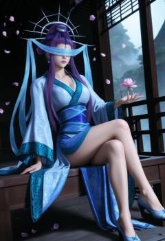masterpiece,best quality,amazing quality,very aesthetic,high resolution,ultra-detailed,absurdres,scenery,photorealistic,(looking at viewer:1.1),(Dark room:1.3),(moody lighting:1.1),peach blossom,falling petals,(large breasts:1.2),yueshen,1girl,solo,purple hair,long hair,hair ornament,chinese clothes,jewelry,sidelocks,blindfold,earrings,hair bun,hair stick,sash,makeup,purple lips,collarbone,updo,shoes,sitting,(crossed legs:1.3) BREAK photorealistic details,<lora:QQSillyueshenV1:0.8>,