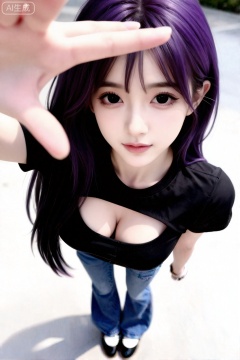 杰作,最佳画质,高质量,**,(紫色头发:1.4),(超长腿:1.3),(细腿:1.4),一个女孩,日常快照高质量人像,全身照,傲人身姿,冷白皮,脸型精致妆容精致鼻梁高挺,发量多又长、发丝清晰可见,表情灵动,看着镜头,绝美眼睛,精致脸蛋黑色瞳孔,黑直长发,现场感,动态抓拍,高颜值纯欲少女,温柔,极具女性魅力,空灵感,清新脱俗,超清画质,青春气息,细节刻画入微,面部特写,浓颜系,美颜暴击,穿着黑色美式辣妹风潮t搭配阔腿牛仔裤,idol,绝美构图,可爱动作,室外,手自然放松的遮太阳