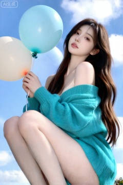 杰作,最佳画质,高质量,,(黑色色头发:1.4),(超长腿:1.3),(细腿:1.4),一个女孩,少女感网拍,冷白皮超美女孩,清透裸妆,户外场景,仰拍镜头,正脸看镜头,蓝天白云,棕色长发,纯欲感,白嫩嫩的皮肤,如琼玉般润滑,蓝绿色慵懒针织外套,手拿气球,纯欲朦胧滤镜,氛围感,姿态慵懒,整体姿态传递出一种沉浸在自我风格中的独特韵味,尽显软萌气质,高颜值