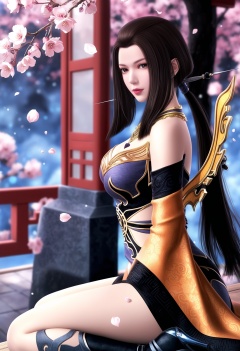 masterpiece,best quality,amazing quality,very aesthetic,high resolution,ultra-detailed,absurdres,scenery,photorealistic,(looking at viewer:1.1),(moody lighting:1.1),peach blossom,falling petals,(large breasts:0.8),yanfei,1girl,solo,long hair,black hair,brown hair,jewelry,dress,brown eyes,necklace,hair ornament,earrings,boots,ponytail,sidelocks,armor,detached sleeves,black footwear,high heels,sitting BREAK photorealistic details,<lora:QQSillyanfeiV1:0.8>,