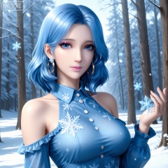 masterpiece,high quality,tall,game cg,highres,(soft light:1.2),white_skin,(shiny_skin:0.6),(realistic:1.1),,shuiyueer,blue eyes,blue hair,short hair,eyelashes,earrings,longeyelashes,makeup,pink lipstick,looking at viewer,long sleeves,nature,flowers,day,1girl,solo,dress,large breasts,earrings,jewelry,long hair,(upper_body:1.2),looking at viewer,hoop earrings,(collared_dress:1.1),bare shoulders,frills,short dress,print_dress,blue dress,winter,sonw,snow,ice,snowflakes,snowfakes floating on the hand,