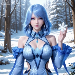 masterpiece,high quality,tall,game cg,highres,(soft light:1.2),white_skin,(shiny_skin:0.6),(realistic:1.1),,shuibinger,blue hair,blue eyes,longeyelashes,makeup,medium hair,looking at viewer,long sleeves,nature,flowers,day,1girl,solo,dress,large breasts,earrings,jewelry,long hair,(upper_body:1.2),looking at viewer,hoop earrings,(collared_dress:1.1),bare shoulders,frills,short dress,print_dress,blue dress,winter,sonw,snow,ice,snowflakes,snowfakes floating on the hand,