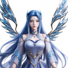 masterpiece,high quality,tall,game cg,highres,(soft light:1.2),white_skin,(realistic:1.1), tangwutong,1girl,long hair,solo,hair ornament,blue hair,blue dress,wings,bracelet,jewelry,blue eyes, tangwutong, 1girl, upper body, blue eyes, solo, long hair, hair ornament, white background, blue hair, wings, dress, looking at viewer, simple background, white dress, closed mouth, expressionless, bare shoulders, blue dress