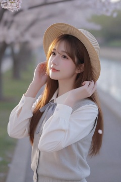 【场景】初夏傍晚,河畔樱花步道,粉白花瓣随风轻落【人物】19岁亚洲少女,暖棕长直发,米白水手领衬衫配浅灰针织马甲,领口缎带微飘【表情/动作】半身微侧,双手轻握草帽边缘贴肩,抬眸望前方,嘴角带笑【妆容】清透奶油肌+淡粉腮红,睫毛自然卷翘,水润蜜桃唇釉【相机】Sony A7III + 85 mm f/1.4,f/1.8 1/500 ISO100,站立平拍【光影】夕阳侧逆光,柔和金边勾勒发丝与脸颊,背景虚化粉绿相间【构图】胸口以上占画面2/3,人物居右三分,前景飘入两片花瓣,背景河面反光成柔亮斑点