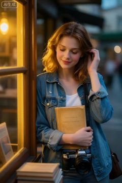 【场景】暮春傍晚,旧书店门口,木质橱窗透出暖黄灯泡光【人物】20岁栗色微卷少女,雾蓝牛仔外套内搭白吊带,胸口挂一枚旧相机胸针【表情/动作】半身倚门框,左手抱旧硬皮小说贴胸口,右手轻挽耳侧碎发,低头浅笑【妆容】哑光裸肌+淡粉腮红,水润玫瑰唇蜜【相机】Canon R5+RF85mm f/1.2,f/1.4 1/320 ISO160,站立平拍【光影】橱窗暖光作主光,右侧夕阳轮廓光勾发丝金边,背景虚化暖黄与冷青对撞【构图】胸口以上占画面2/3,门框内侧形成暗框,人物置中心微偏右,前景一片虚化的泛黄书页增添层次