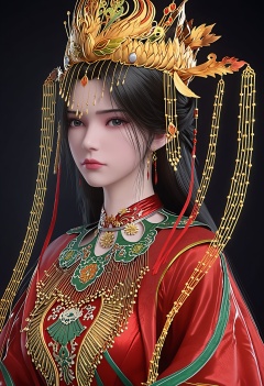 score_9,looking_at_viewer,upper body,large breasts,1girl,solo,long hair,chinese clothes,jewelry,hair ornament,black hair,dress,closed mouth,red dress,earrings,crown,realistic,long sleeves,brown hair,expressionless,tiara,wide sleeves,headdress,shoes,(simple background,pure black background,black background:1.1),perfect_anatomy,<lora:QQSponylimuwanhunfu:0.8>,