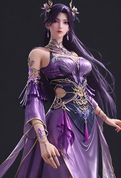 score_9,looking_at_viewer,upper body,large breasts,1girl,solo,long hair,hair ornament,jewelry,earrings,dress,bare shoulders,purple dress,closed mouth,expressionless,black hair,clothing cutout,detached sleeves,purple hair,bracelet,purple eyes,high heels,(simple background,pure black background,black background:1.1),perfect_anatomy,<lora:QQSponyyanqingchengV1:0.8>,