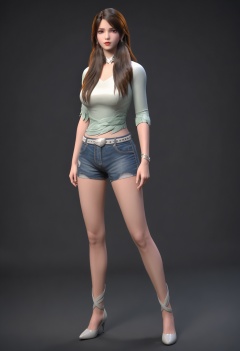 score_9,looking_at_viewer,(large breasts:0.8),1girl,solo,brown hair,long hair,realistic,brown eyes,lips,jewelry,earrings,shirt,necklace,red lips,denim,shorts,belt,high heels,standing,(simple background,pure black background,black background:1.1),perfect_anatomy,<lora:QQSponybaizhiV1:0.8>,