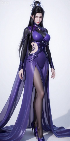 她穿着一套引人注目的未来主义风格的紫色和黑色组合服装。她的上半身是黑色长袖,紫色的高领披在肩上。紫色衣物包裹住她丰满的胸脯,上衣腰间两侧有着切口,露出腰间的精美,在剪裁的下方,有一条紫色的丝带状设计环绕着她的腰部,并延伸成一条飘逸的紫色半透明裙子,一直延伸到地板上。这条裙子两边有一个高开衩,露出了她的黑色透明的裤袜腿,她穿着紫色的精美高跟鞋。